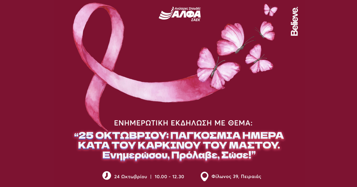 Ανώτερες Σχολές ΑΛΦΑ, συνεπείς αρωγοί δράσεων εθελοντισμού, ενημέρωσης και ευαισθητοποίησης για μείζονα θέματα που αφορούν μεγάλη μερίδα κόσμου, διοργανώνουν ενημερωτική εκδήλωση με αφορμή την 25η Οκτωβρίου- Παγκόσμια Ημέρα κατά του Καρκίνου του Μαστού- και σύνθημα «Ενημερώσου, Πρόλαβε, Σώσε»!