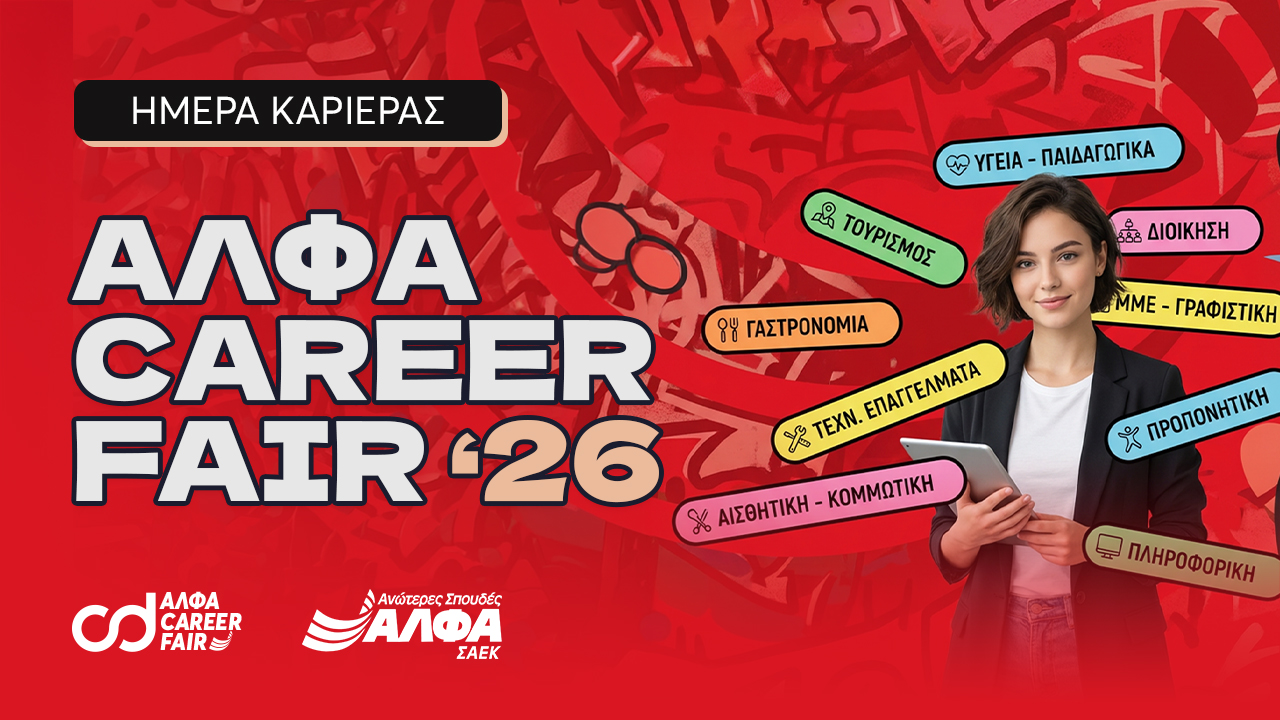 ΑΛΦΑ Career Fair, τη Δευτέρα 2 Μαρτίου και ώρες 10.00-14.00 στο Electra Palace (Αριστοτέλους 9). Μια Ημέρα Καριέρας όπου -και φέτος- θα δώσουν το «παρών» οι πλέον «δυνατές» εθνικές και πολυεθνικές επιχειρήσεις με έναν βασικό στόχο: τη δικτύωση των σπουδαστών και αποφοίτων της ΣΑΕΚ ΑΛΦΑ Θεσσαλονίκης και την ενίσχυση των επαγγελματικών τους προοπτικών!