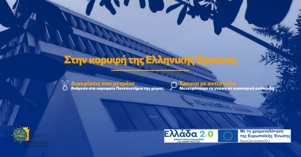 Το Πανεπιστήμιο Μακεδονίας (ΠΑΜΑΚ), επιβεβαιώνοντας τον ηγετικό του ρόλο στην ακαδημαϊκή και ερευνητική αριστεία, παρουσιάζει τα αποτελέσματα της στρατηγικής του δράσης για τη σύνδεση της γνώσης με την παραγωγική διαδικασία.